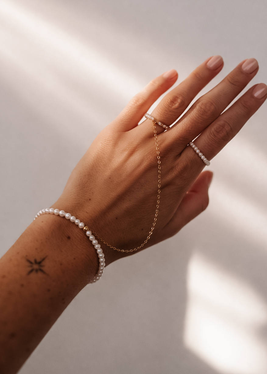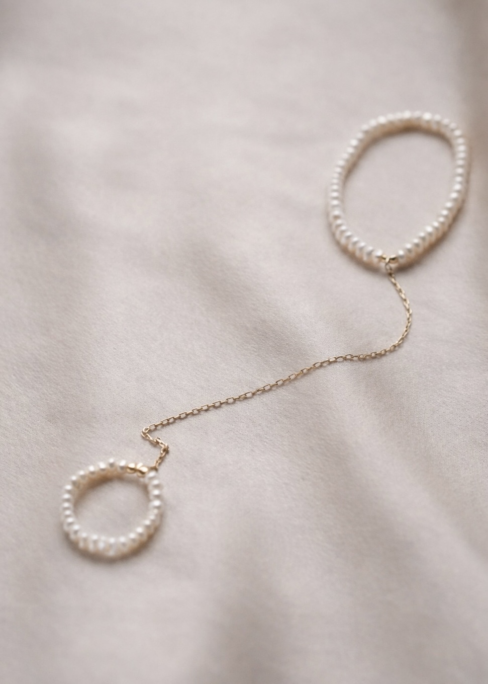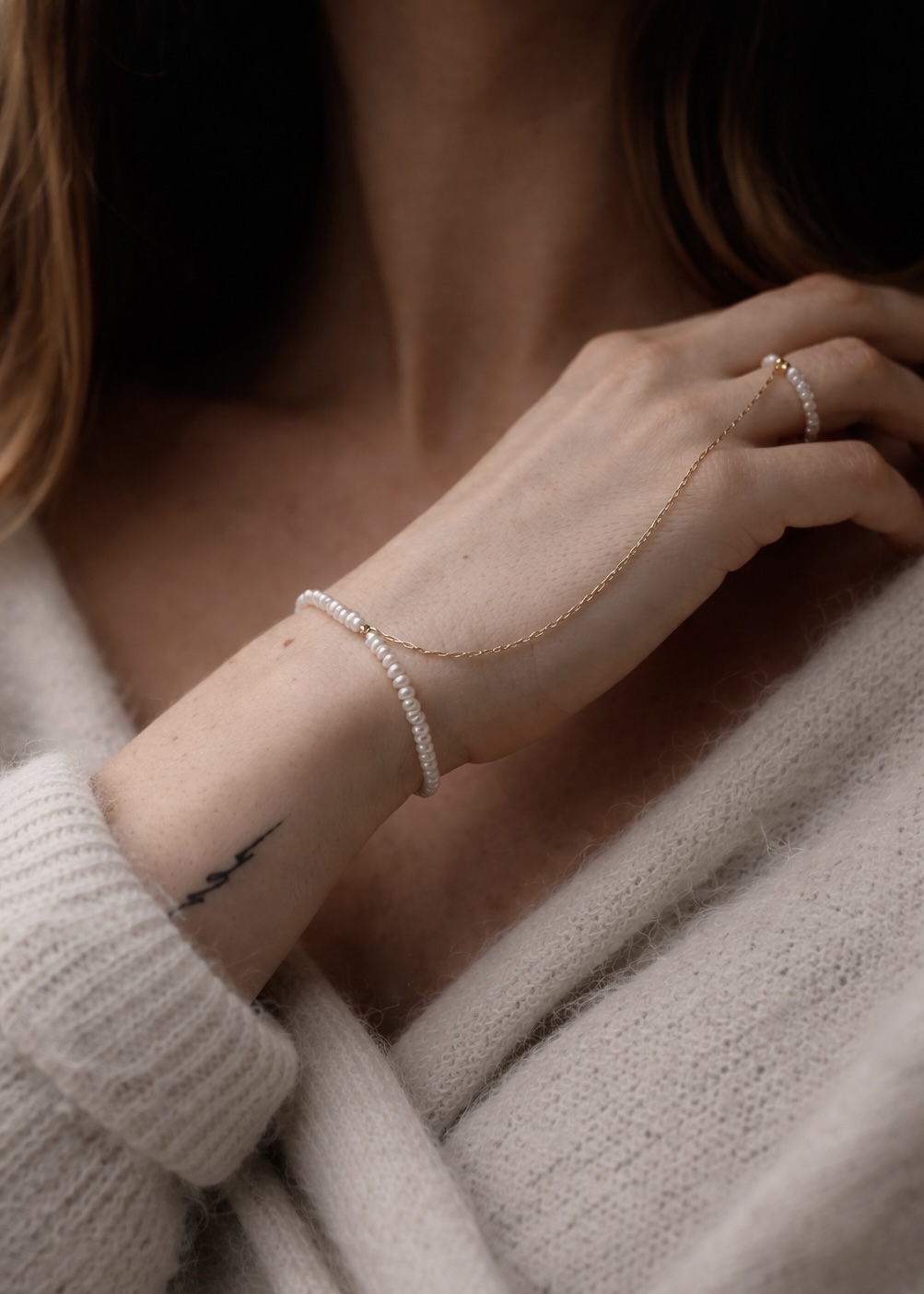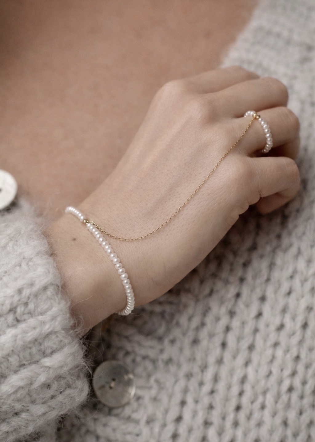Bransoletka z pierścionkiem z malutkich pereł naturalnych o idealnym śmietankowym odcieniu.